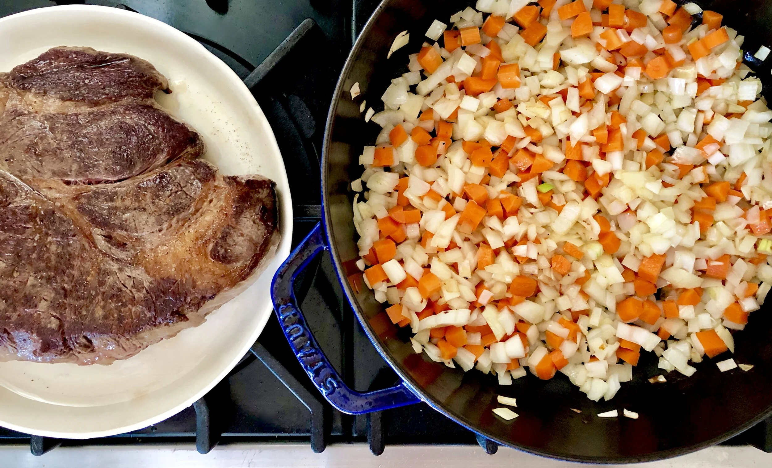 Preheat oven to 325 degrees. Pat chuck roast dry with paper toweling and season well with salt and pepper.